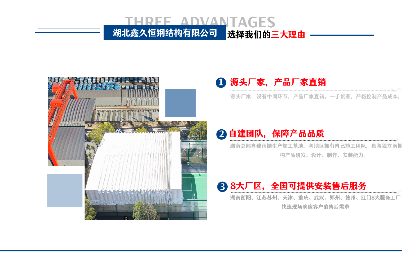 湖北鑫久恒鋼結(jié)構(gòu)有限公司是一家電動雨棚、膜結(jié)構(gòu)車棚研發(fā),生產(chǎn)銷售,施工安裝于一體的專業(yè)鋼結(jié)構(gòu)科技公司,主要產(chǎn)品有伸縮雨棚,電動雨棚,膜結(jié)構(gòu)車棚等。  湖南地區(qū)職員目前有80多人,占地面積20000平方米,廠房面積15600平方米,配備先進的生產(chǎn)流水線,使每件品質(zhì)產(chǎn)品的堅實基礎(chǔ)。  公司在蘇州、天津、重慶、武漢、德州、烏魯木齊、江門均設(shè)有服務(wù)工廠,總?cè)藛T共300多人,擁有專業(yè)的技術(shù)團隊,配備先進的設(shè)備和流水線生產(chǎn),產(chǎn)能高,貨源充足,發(fā)貨速度快,服務(wù)區(qū)域廣。  移動伸縮棚適用于通道臨時倉儲、戶外運動遮陽、污水池遮蓋、能源交通、熱力化工、礦山、船舶制造及市政建設(shè)、物流、碼頭等領(lǐng)域的構(gòu)件制作加工,成品半成品存放、倉庫、野外儀器設(shè)備操作用房等。尤其是對工廠發(fā)貨、倉儲臨時遮雨防嗮,梅雨期較長、建設(shè)周期較短的工程施工等特別適用。還可根據(jù)用戶需求量身定制、適合企業(yè)所需不同款式的產(chǎn)品。  我公司堅持“誠信社會為本,客戶滿意為榮”的經(jīng)營理念,做到質(zhì)量把控,嚴(yán)格管理,精益求精,恪守承諾。使鑫久恒逐步走向成熟,其系統(tǒng)化、專業(yè)化日趨完善。以專業(yè)的技術(shù)、科學(xué)的管理,更高的產(chǎn)品質(zhì)量,優(yōu)良的企業(yè)信譽,真誠的客戶服務(wù),靈活多樣的經(jīng)營方式和務(wù)實創(chuàng)新的企業(yè)精神愿與社會各界攜手合作,為推動智能鋼結(jié)構(gòu)建筑事業(yè)的發(fā)展而不斷努力。...